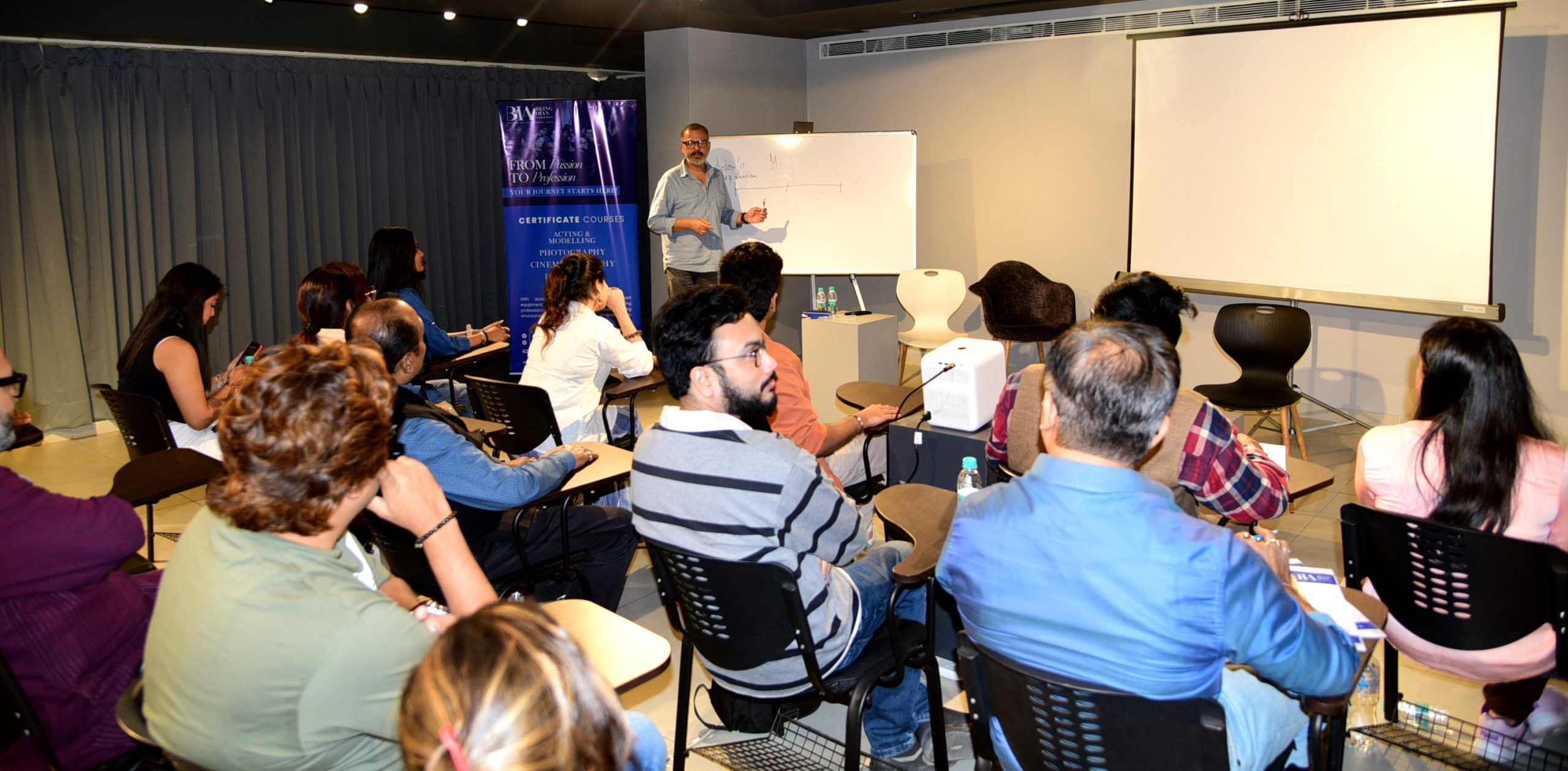 প্রথম একাডেমিক সেশন শুরু হবে জানুয়ারি মাসে এবং ভর্তি প্রক্রিয়া শুরু করতে বি আই এ আয়োজন করে জাতীয় পুরস্কার প্রাপ্ত পরিচালক অতনু ঘোষ পরিচালিত একটি বিশেষ ফিল্ম অ্যাক্টিং ওয়ার্কশপ। আগ্রহী অভিনেতারা ভারতের অন্যতম প্রখ্যাত চলচ্চিত্র নির্মাতার কাছ থেকে সরাসরি স্ক্রিন-পারফরম্যান্সের শিল্প ও সূক্ষ্মতা শেখার বিরল সুযোগ পান। ‘ময়ূরাক্ষী’, ‘অংশুমানের ছবি’, ‘অ্যাবি সেন’, ‘বিনি সুতোয়’ এবং ‘শেষ পাতা’র মতো প্রশংসিত ছবির নির্মাতা অতনু ঘোষের দিকনির্দেশনা অংশগ্রহণকারীদের জন্য চলচ্চিত্র জগতের এক অনন্য অভিজ্ঞতা ও গভীর অন্তর্দৃষ্টি প্রদান করে। কর্মশালায় অংশগ্রহণকারী প্রার্থীদের কর্মশালা শেষে ভর্তি করা হয়।