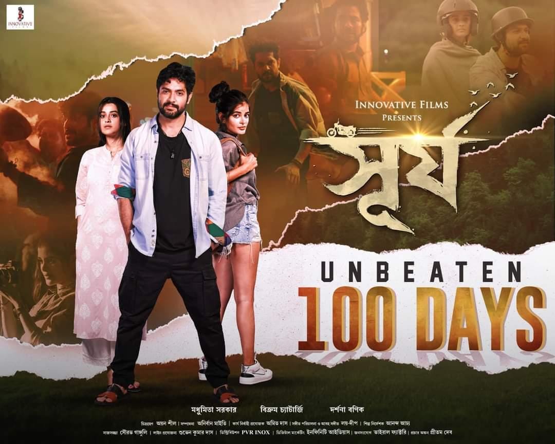 ছবিতে বিক্রম চ্যাটার্জির বিপরীতে দেখা গিয়েছে অভিনেত্রী মধুমিতা সরকার ও দর্শনা বনিক কে। উমা চরিত্রে দেখা গিয়েছে অভিনেত্রী মধুমিতা সরকার কে ও দিয়া চরিত্রে দেখা গিয়েছে অভিনেত্রী দর্শনা বনিক কে। ছবির পরিচালনার দ্বায়িত্বে রয়েছেন পরিচালক শিলাদিত্য মৌলিক। আর গতকাল “সূর্য” বড়োপর্দায় ১০০ দিন পূর্ণ হল। ১০০ দিনের উদযাপনের অনুষ্ঠান সেলিব্রেশন হল শহরে। উপস্থিত ছিলেন ছবির সমস্ত অভিনেতা অভিনেত্রী ও কলাকূশলীরা।