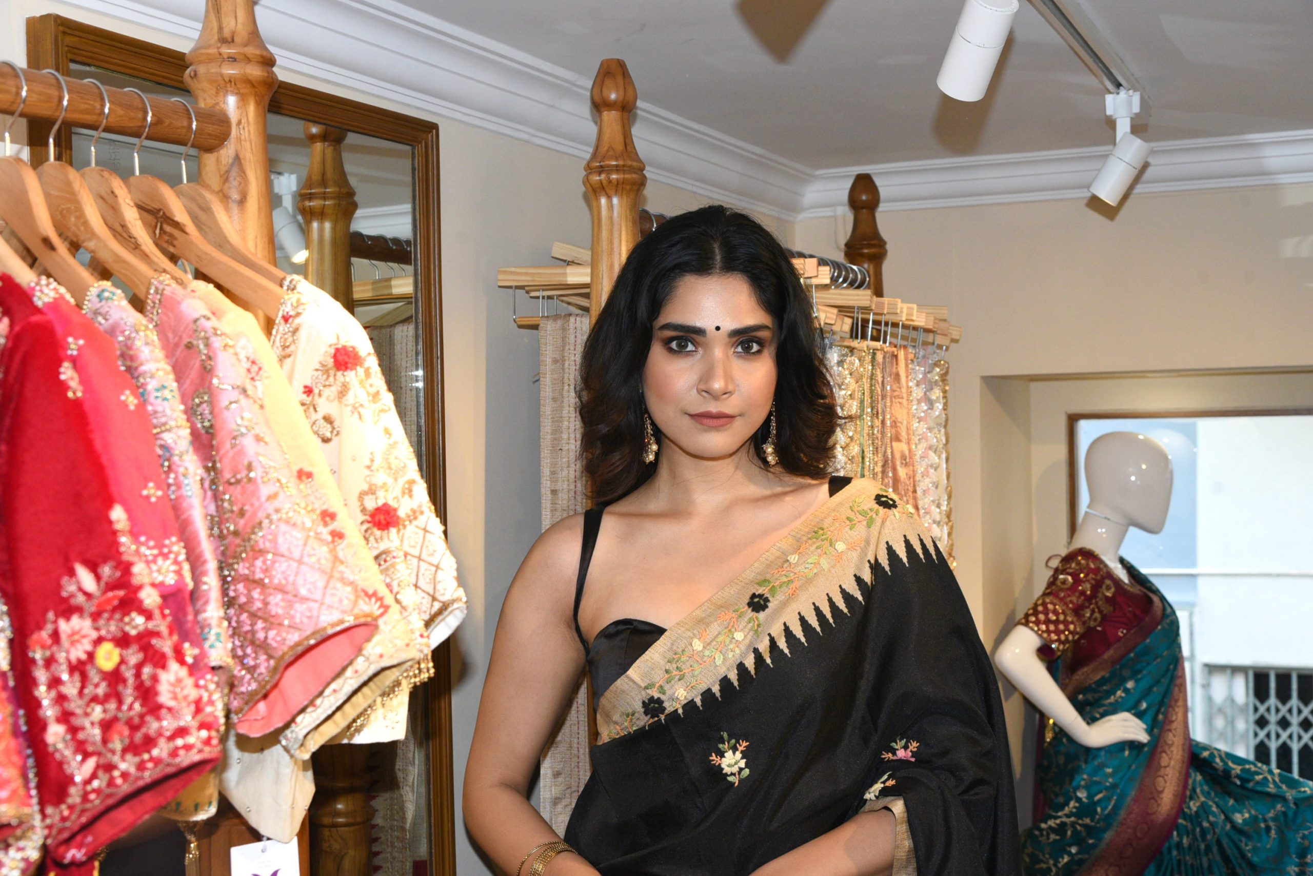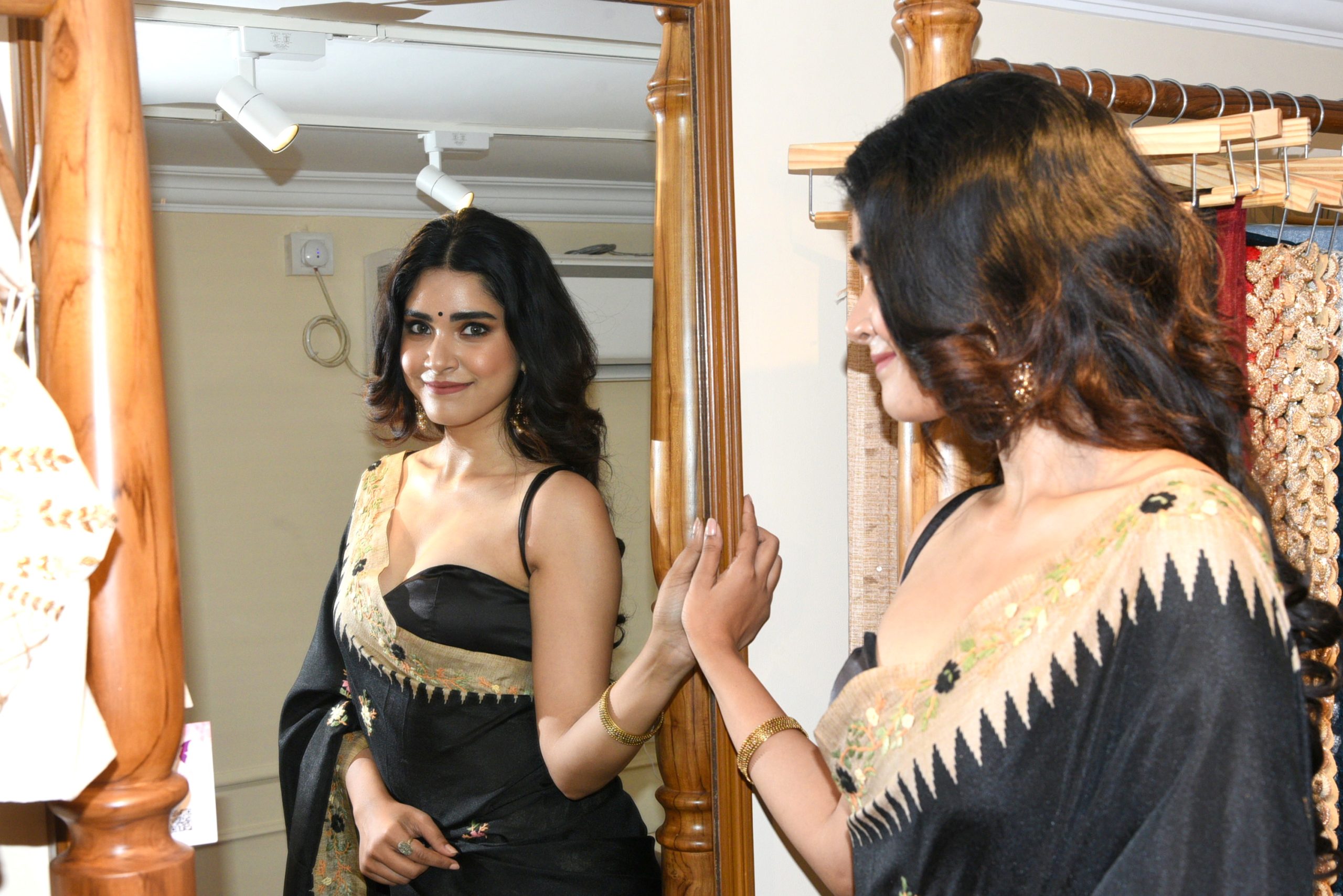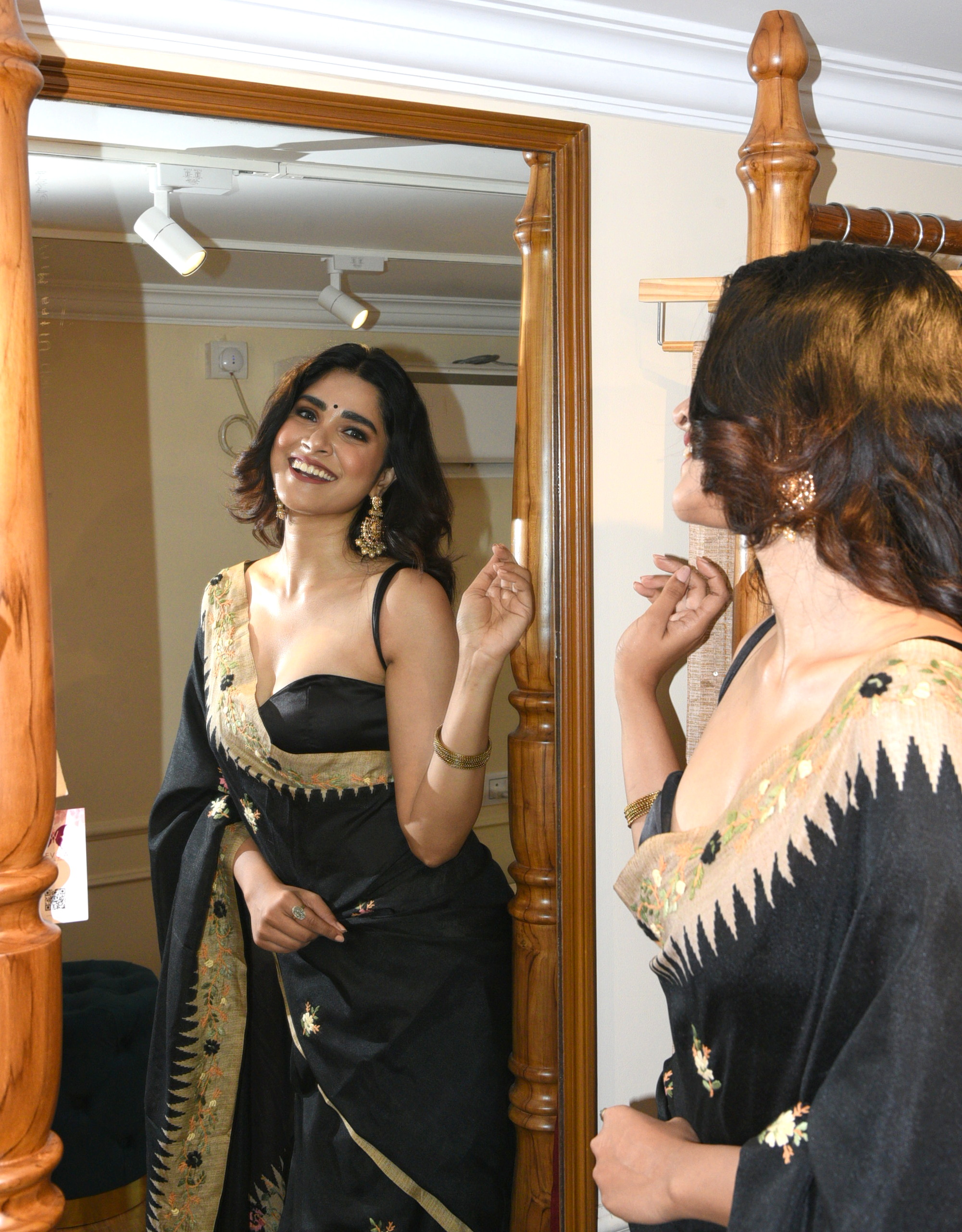 Spanning 500 square feet, the Southern Avenue store blended old-world charm with thoughtful contemporary elegance. The space is divided across two levels: the ground floor is dedicated to daily wear, office-friendly pieces, and relaxed casuals, while the mezzanine floor offers a more indulgent selection of festive and bridal wear — from embroidered zardozi blouses to richly woven sarees. The boutique interiors feature a striking black-and-white chequered floor, soft ivory-toned walls, and antique brass chandeliers that cast a warm, timeless glow. Elegant wall sconces and carved mirrors enhanced the space’s boutique character, creating a serene yet sophisticated atmosphere that mirrors the brand’s design philosophy.