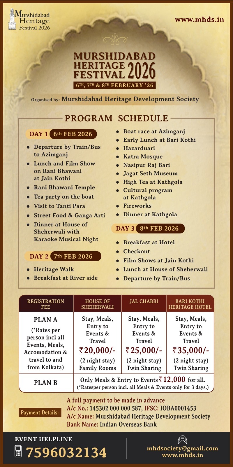 মুর্শিদাবাদ হেরিটেজ ফেস্টিভ্যাল ২০২৬ শুধুমাত্র একটি উৎসব নয়—এটি ইতিহাস, শিল্প ও সৌন্দর্যের এক জীবন্ত জগতে প্রবেশের বিরল সুযোগ।